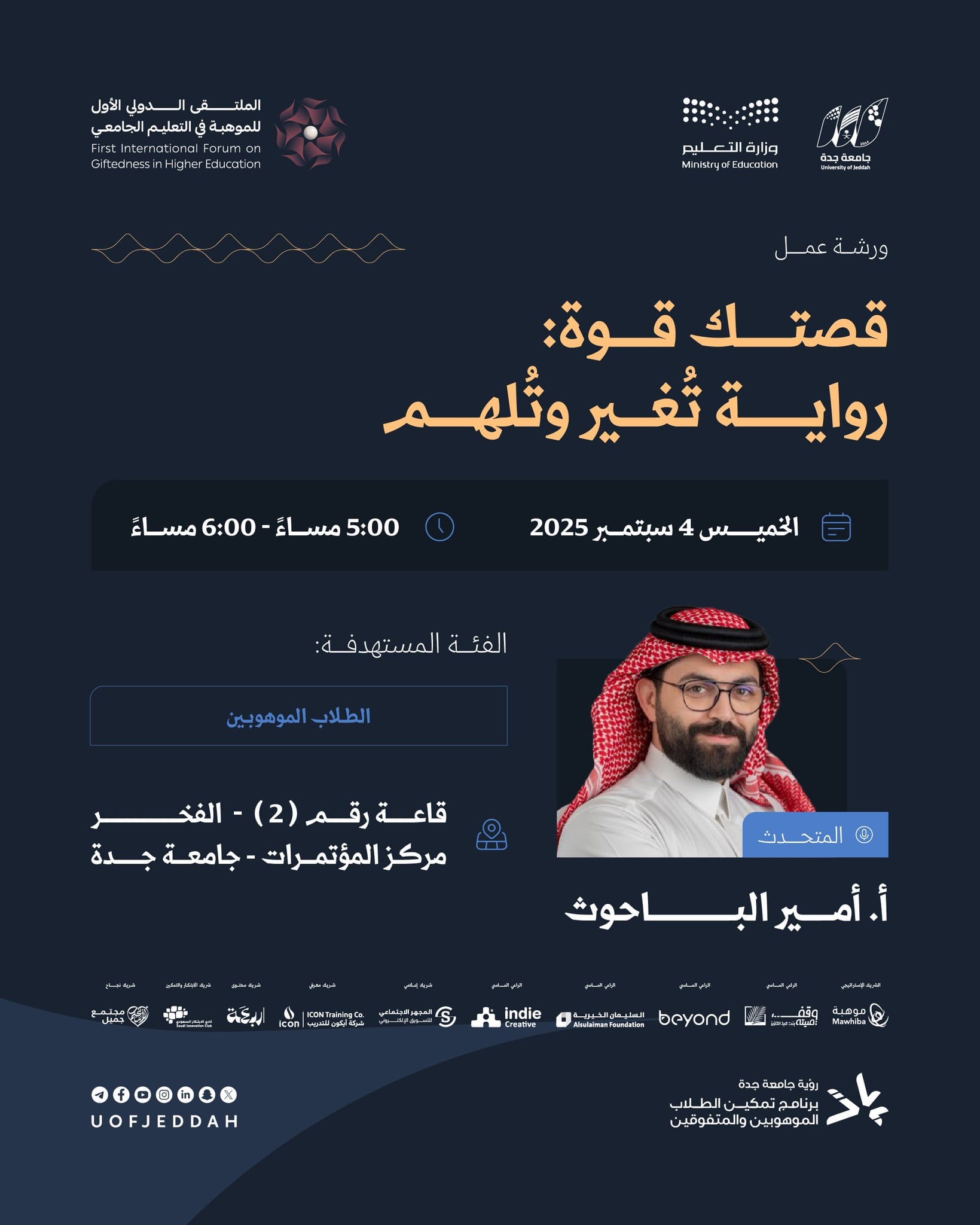 On September 3–4, 2025, the University of Jeddah hosted its first-ever International Forum for Giftedness in Higher Education, under the patronage of the Minister of Education. Arbaaa Marketing participated as a content partner, contributing to discussions on talent development, storytelling, and innovation — all aligning with Saudi Vision 2030.